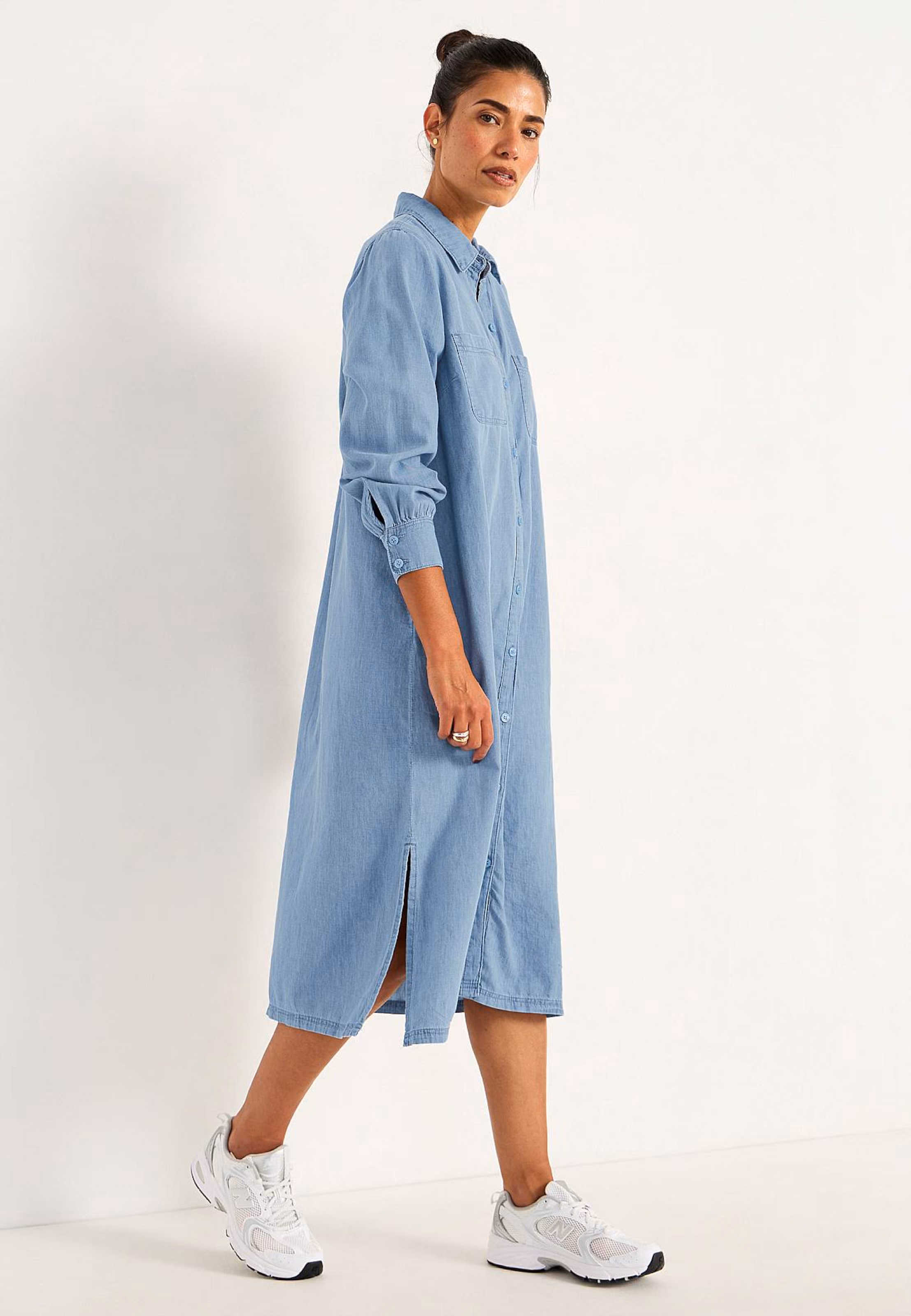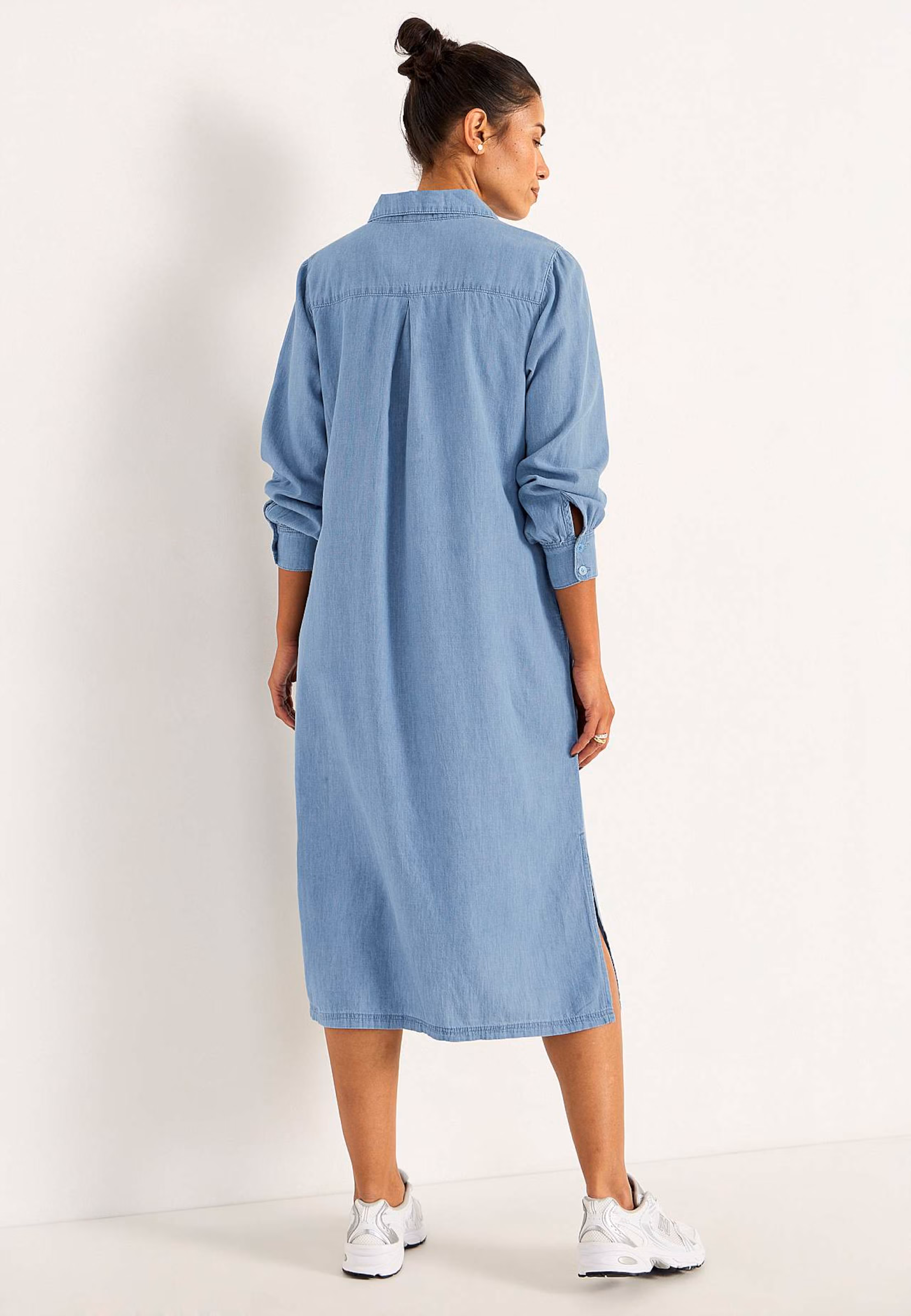 Klänning i mjuk, lite tunnare denimkvalitet med slits i sidorna. Rymlig i passformen.